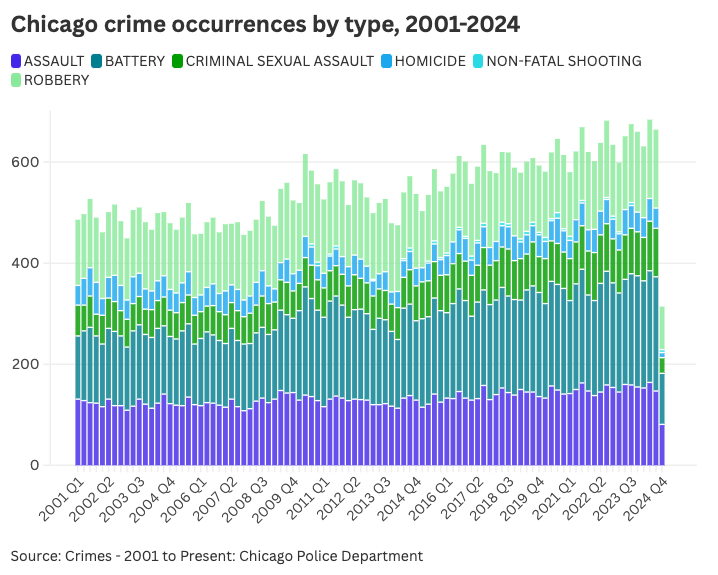 Utilizing Flourish, I created this data visualization in September 2024 using crime occurrence data from the Chicago Police Department from 2001 to present. Breaking down each crime by type, I aimed to show trends in certain kinds of crimes per year in a city historically impacted by crime.
