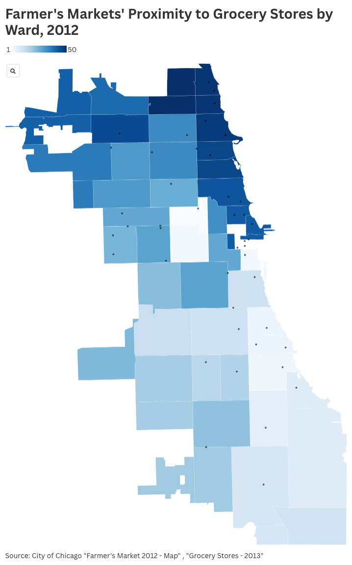 I created this visualization in October 2024 based on City of Chicago data from 2012 detailing the locations of farmer's markets and the number of grocery stores per ward. With Flourish, I created a map visualization that should serve to highlight food insecurity alongside grassroots efforts to bring fresh food via farmer's markets.
